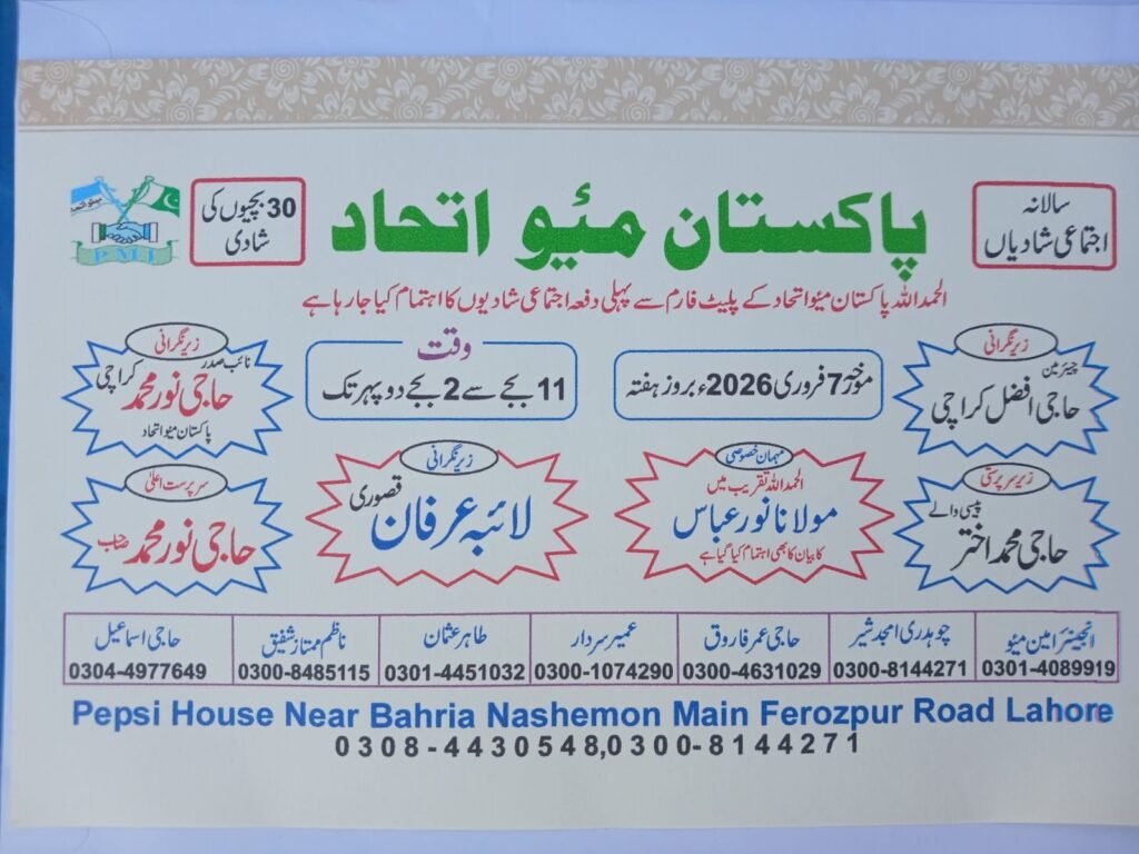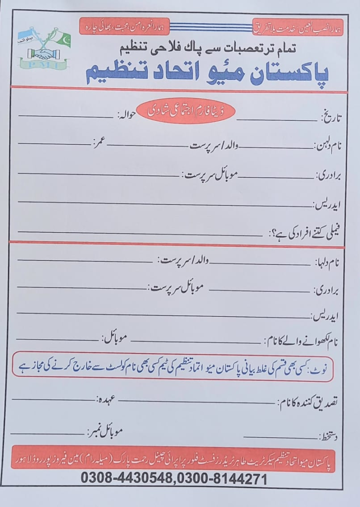 پاکستان میو اتحاد کی قیادت میں پانڈوکی سے محمد سردار نمبر دار کی طرف سے عید الفطر کے بعد پانچ اجتماعی شادیوں کا اعلان ۔